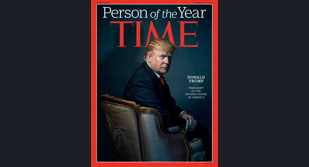 2016年,《时代》将他评为“年度人物”(Person of the Year),理由是他“重塑了美国政治现实”。那张封面上,他端坐在金色椅子上,背对国旗,阴影笼罩在他身后——评论家称那是“历史上最有暗示性的一次构图”。