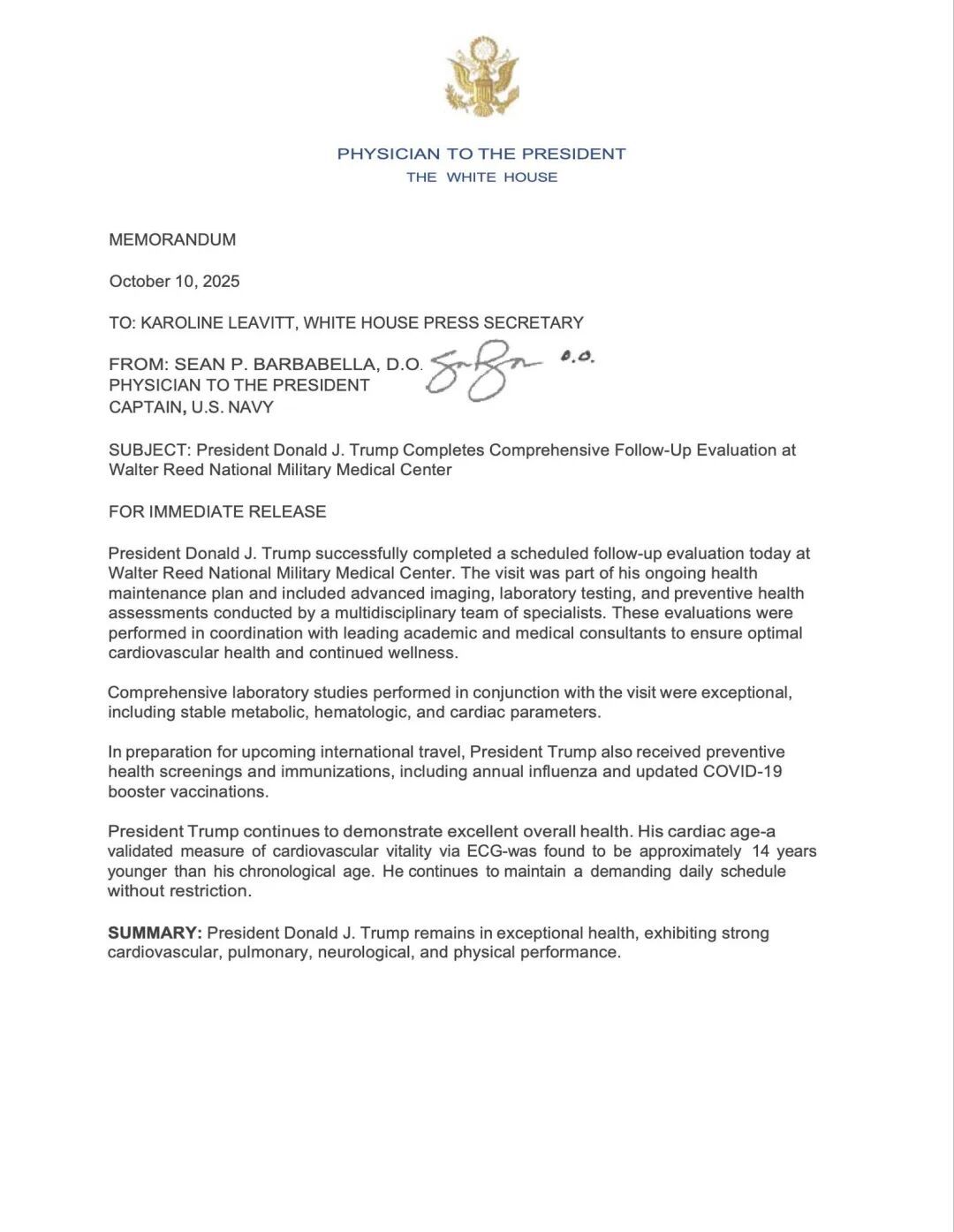 他在华盛顿国家军事医疗中心接受了全面检查,涵盖心血管、神经、肾功能与血液指标。10月10日,根据白宫的备忘录:医生尚·巴巴贝拉出具报告,确认总统“无心衰、无血栓、肾功能正常”,并给出了极具政治传播力的一句话:“特朗普的心脏年龄比实际年龄年轻14岁。”