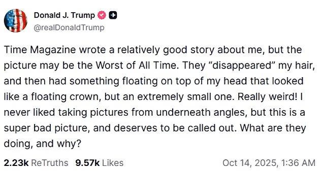 而特朗普本人——显然怒不可遏。凌晨1点30分,他在Truth Social上发帖,语气充满了愤怒与质问:“《时代》杂志写了一篇还算不错的报道,但那张照片可能是史上最糟糕的。他们‘弄坏’了我的头发,还让我头顶飘着一个奇怪的、像皇冠一样的小玩意儿。真怪!我从来不喜欢低角度拍摄,这张简直糟透了。为什么要这样?”